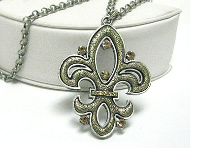 Crystal stud scratch metal fleur de lis pendant long chain necklace