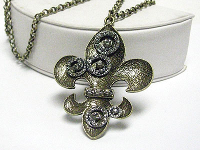 Crystal stud scratch metal fleur de lis pendant long chain necklace