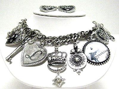 WHOLESALE ANTIQUE LOOK MULTI CHARM DANGLE CHAIN NECKLACE SET 347329