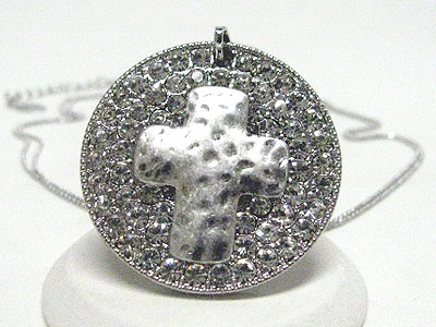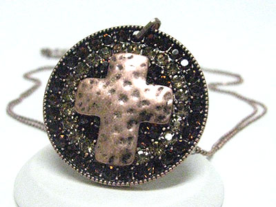 WHOLESALE HAMMERED METAL CROSS CRYSTAL ROUND PENDANT NECKLACE 347334