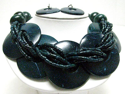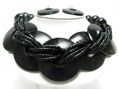 Ethnic style multi seed beads and wood donut braided necklace set