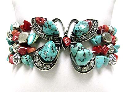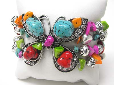 Natural chip stone and crystal butterfly stretch bracelet