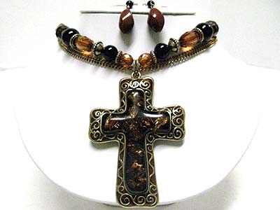 WHOLESALE BURNISH METAL AND GLASS ART WORK CROSS PENDANT NECKLACE SET 347538