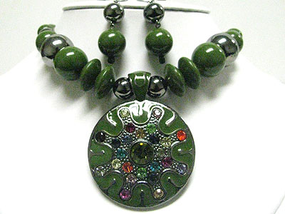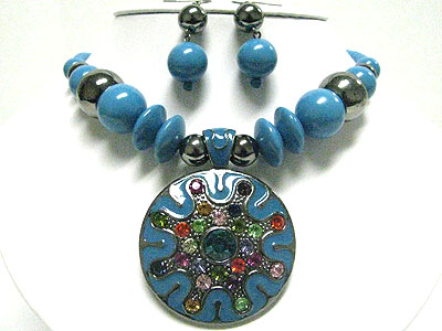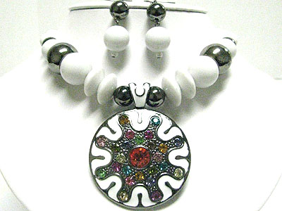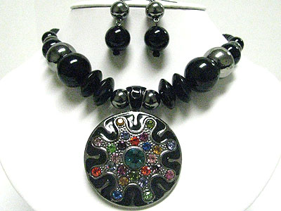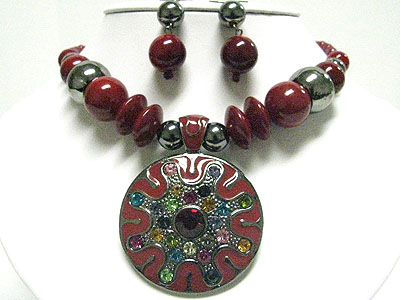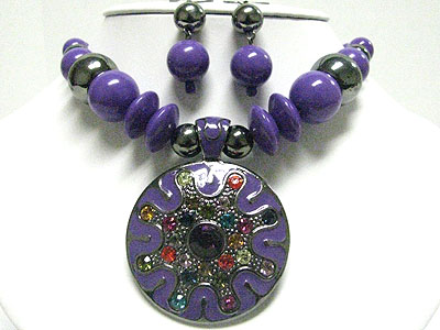Multi color crystal deco round eameled metal pendant and beads necklace set