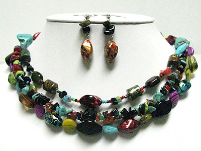 Triple row multi stone and beads necklace set