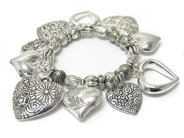 WHOLESALE TRI TONE METAL FILIGREE HEART DANGLE STRETCH BRACELET 348010