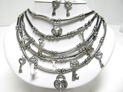 Key and lock charm 5 row metal tube and bradied cord link necklace set