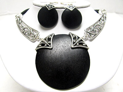 WHOLESALE BURNISH METAL ROUND WOOD PENDANT NECKLACE EARRING SET 348166