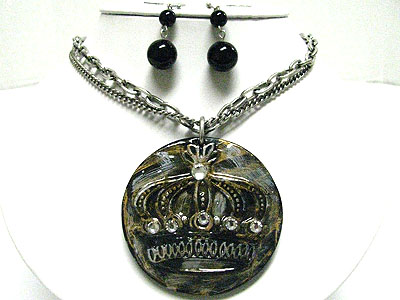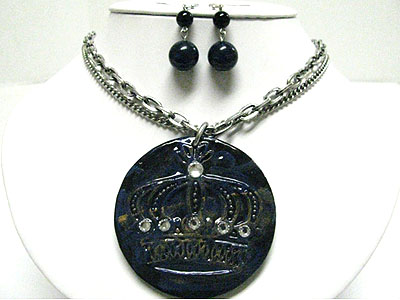 WHOLESALE ACRYLIC PATINA CRYSTAL CROWN ROUND PENDANT NECKLACE SET 348492
