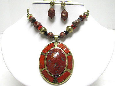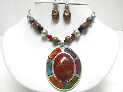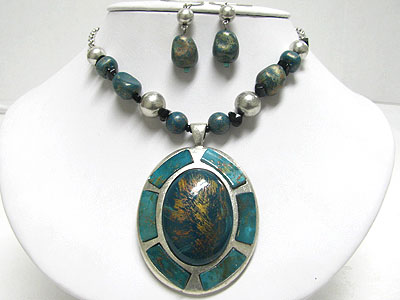 Patina metal work oval pendant multi beads necklace set