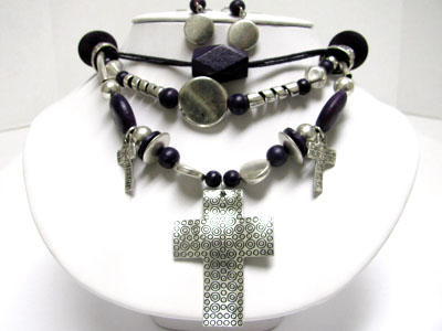 Multi round metal cross and wooden ball necklace set