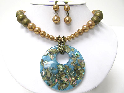 Abalon art work round pendant pearl beads neckalce set
