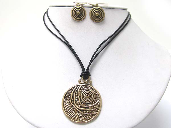 WHOLESALE TEXTURED BURNISH ROUND METAL PEANDANT CORD NECKLACE SET 349214