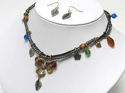 Tri tone burnish metal leaves and flower dangle necklace set
