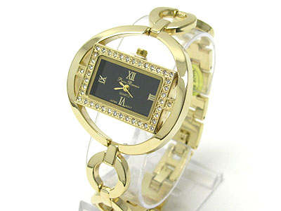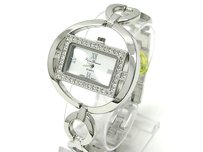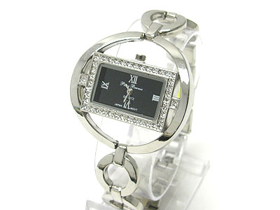 Crystal frame square face round metal band link watch