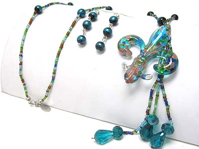 Murano glass works fleur de lis pendant and mixed beads long necklace set