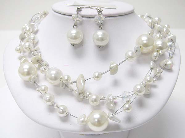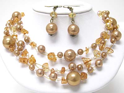 WHOLESALE TRIPLE STRAND PEARL BALL AND MIXED CHIP STONE LINK NECKLACE SET 349597