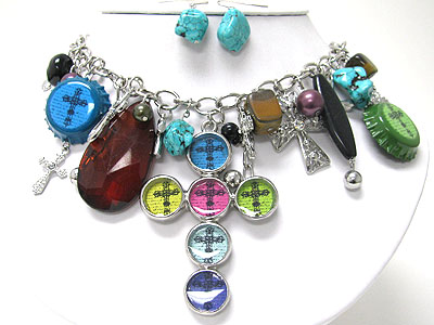 WHOLESALE MULTI MIXED MATERIAL CROSS CHARM AND NATURAL STONE DANGLE NECKLACE SET 349731