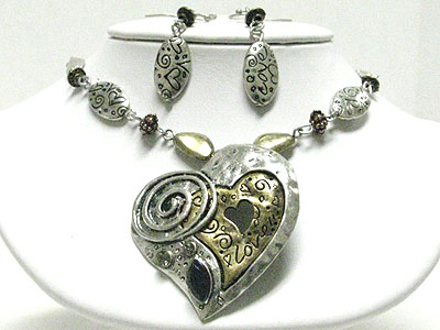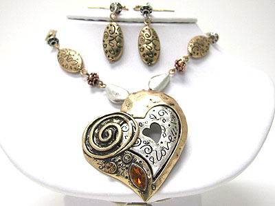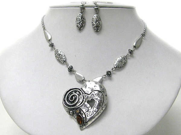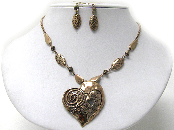 WHOLESALE BURNISH METAL MOTIF ART HERT PENDANT NECKLACE SET 349914