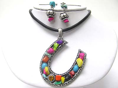 Crystal and natural chip stone deco horse shoe charm cord necklace earring set