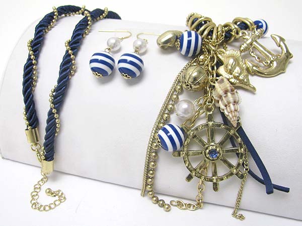 WHOLESALE MULTI NAUTICAL THEME CHARM AND BEADS DANGLE ROPE LONG NECKALCE EARRING SET 350619
