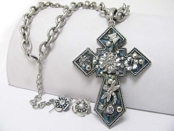 WHOLESALE ANTIQUE STYLE CRYSTAL AND METAL DECO CROSS PENDANT NECKLACE EARRING SET 350623
