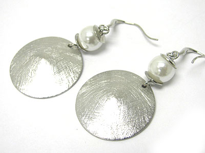 Pearl beads and cut out round hollow scratch metal earring - brass metal