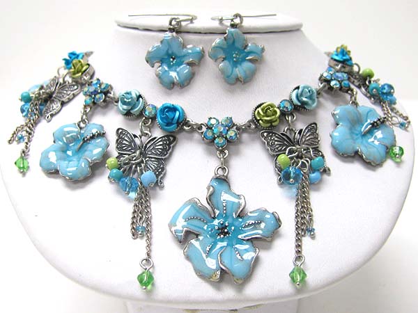 WHOLESALE CRYSTAL AND ENAMEL ART DECO FLOWER THEME NECKLACE EARRING SET 350790