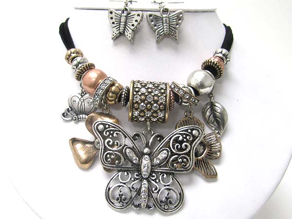 Antique look crystal stud multi burnish metal flower and butterfly dangle cord necklace set