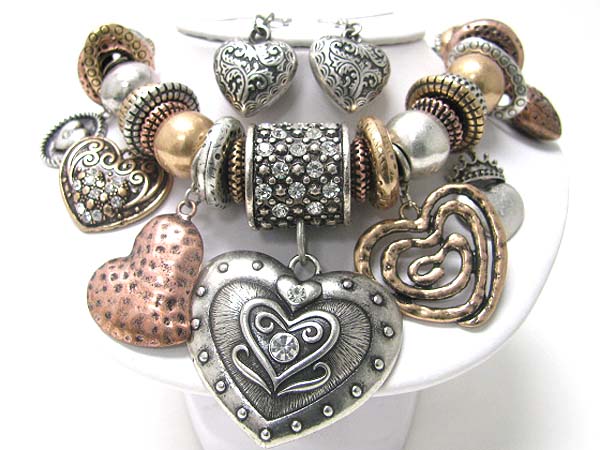Antique look crystal stud multi burnish metal multi heart dangle cord necklace set