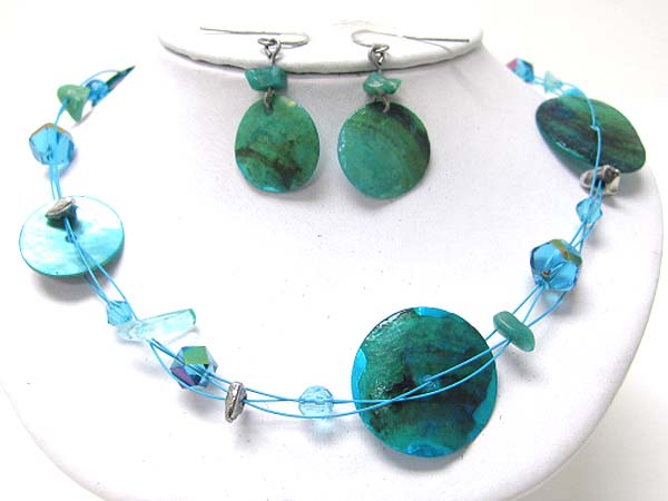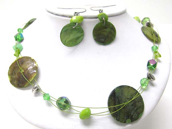 Sea shell disk and chip stone and mixed beads necklace earring set