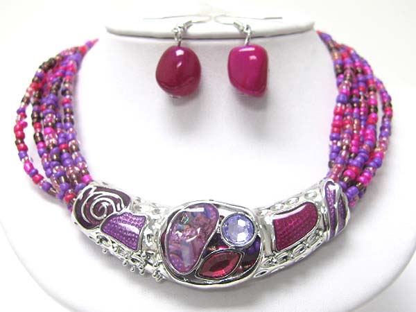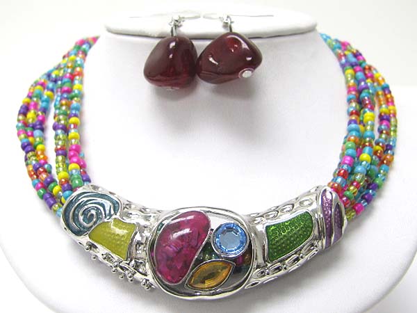 WHOLESALE GLASS AND METAL ART METAL TUBE PENDANT SEED BEADS NECKLACE SET 351013