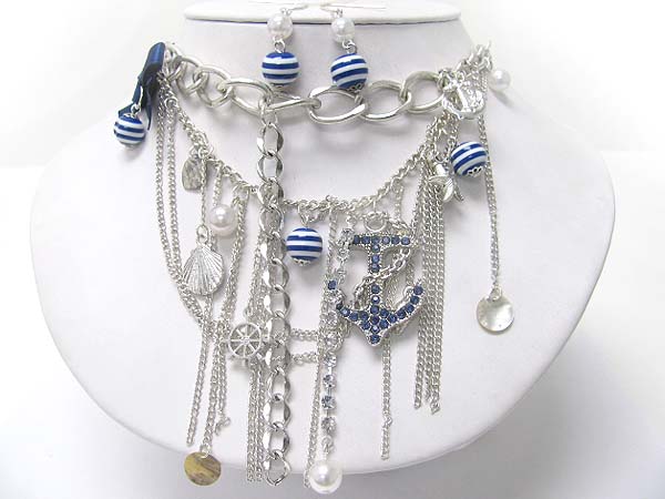 Multi layer nautical theme charm hanging chain neckalce earring set