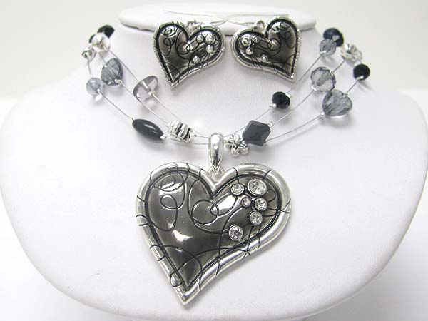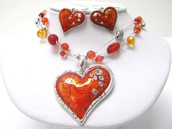 WHOLESALE CRYSTAL AND ENAMEL ART METAL HEART AND BEADS NECKLACE EARRING SET 351049