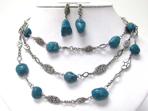 WHOLESALE TRIPLE LAYER NATURAL STONE AND PEBBLE METAL DISK LINK NECKLACE SET 351140