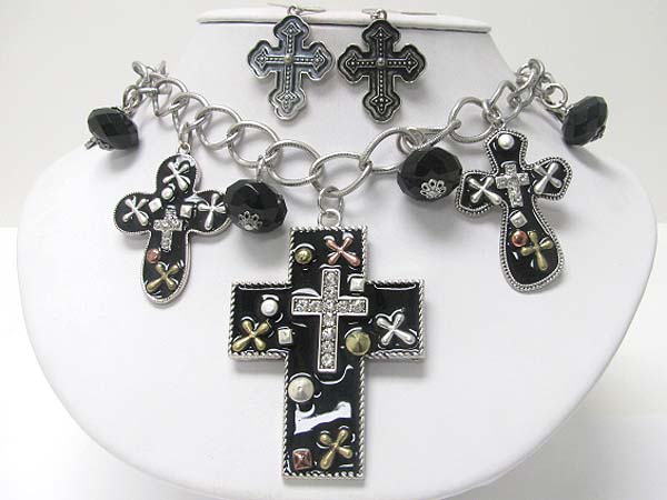 Crystal stud metal patina cross heart charm beads and chain necklace set
