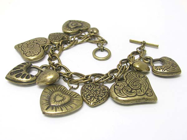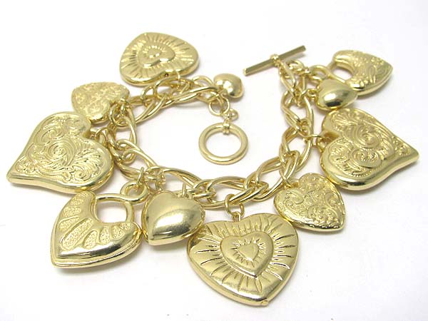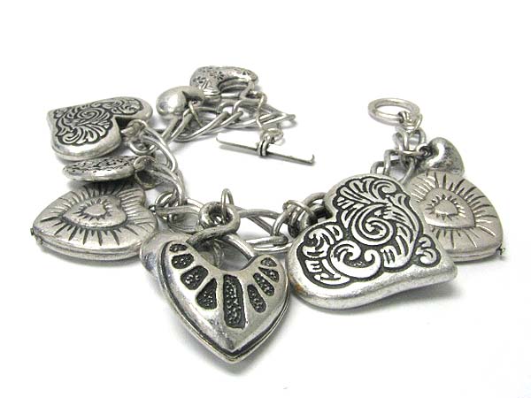 WHOLESALE MULTI METAL TEXTURE HEART CHARM TOGGLE BRACELET 351654