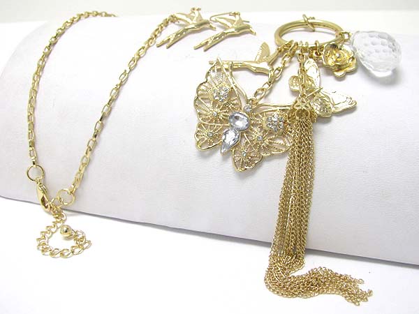 Crystal stud butterfly pendant and tassel drop long necklace earring set