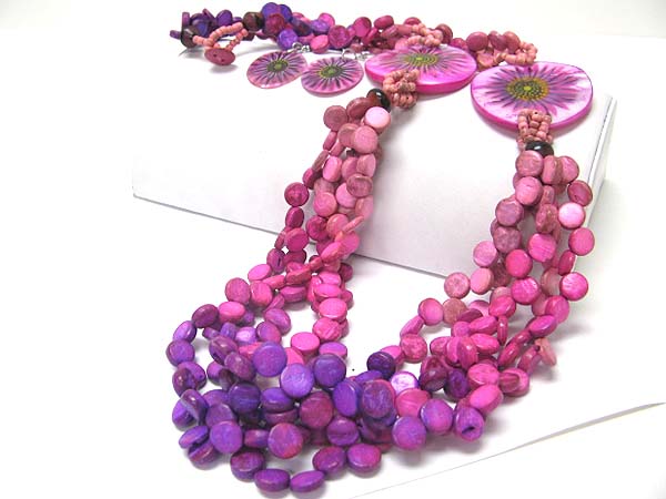 Dyed small shell disk and flower engraved disk link long necklace earring set
