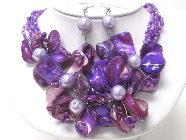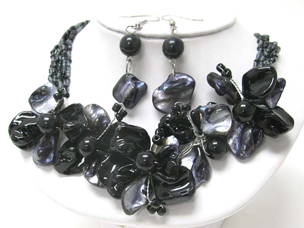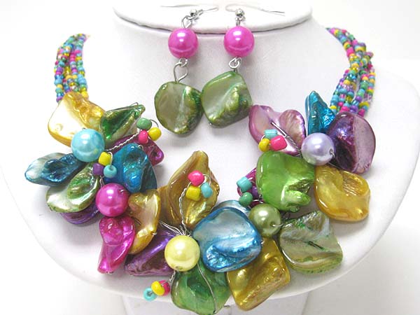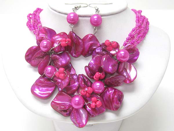 Sea shell multi flower and seed beads necklace earring set