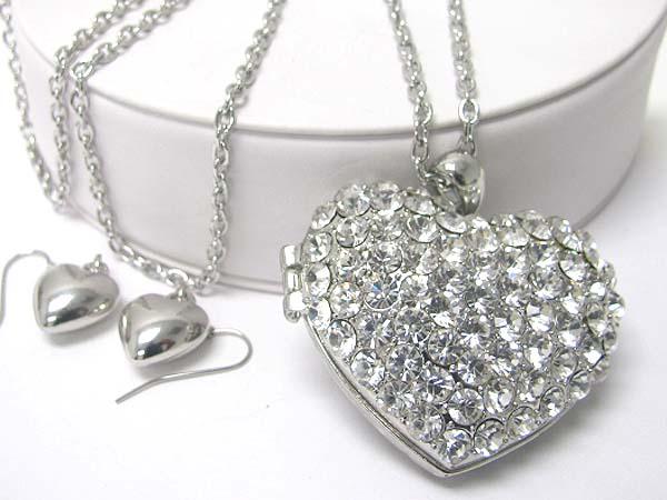 WHOLESALE CRYSTAL STUD HEART LOCKET PENDANT LONG NECKLACE EARRING SET 352405