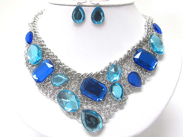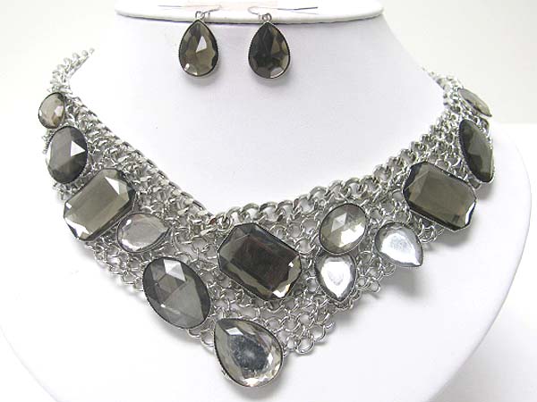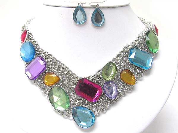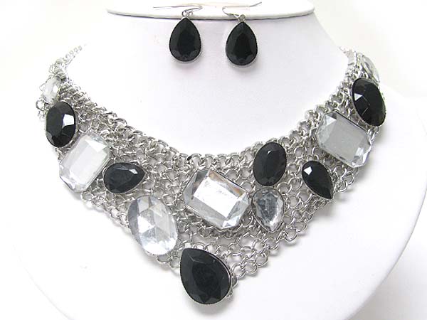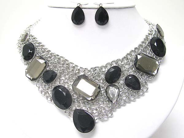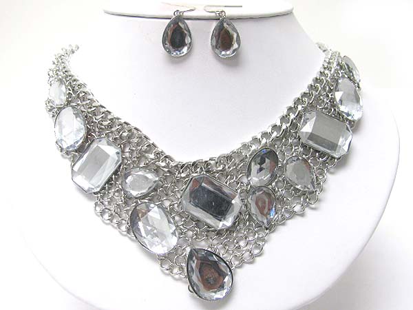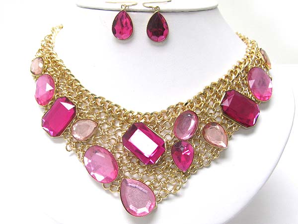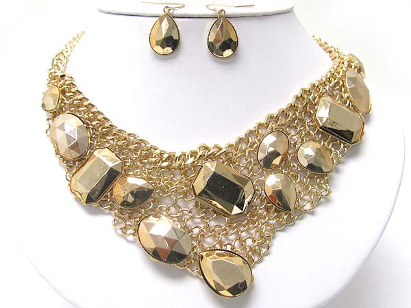 WHOLESALE FACET STONE AND METAL CHAIN LINK BIB STYLE NECKLACE EARRING SET 352542