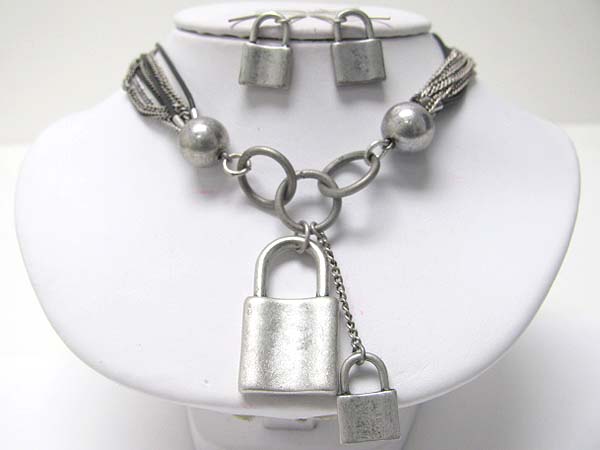 WHOLESALE DUAL LOCK PENDANT AND MULTI CHAIN NECKLACE EARRING SET 352705