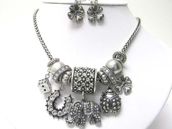 Crystal stud chunky metal beads and lucky charm necklace earring set