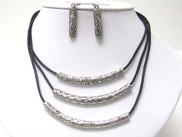 WHOLESALE TRIPLE TEXTURED METAL TUBE AND CORD NECKLACE EARRING SET 353205