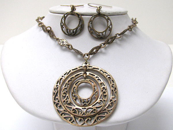 Tri tone filigree metal round pendant necklace earring set