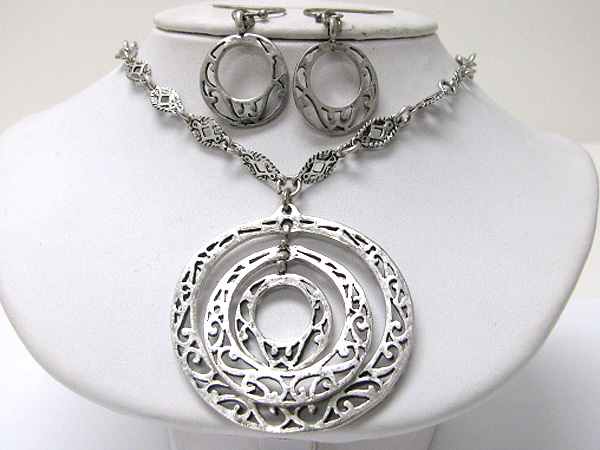 WHOLESALE TRI TONE FILIGREE METAL ROUND PENDANT NECKLACE EARRING SET 353213