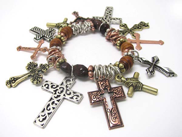 Multi mixed textured metal cross charm dangle stretch bracelet