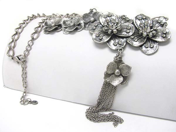 Crystal stud filigree metal flowers and tassel drop long necklace earring set