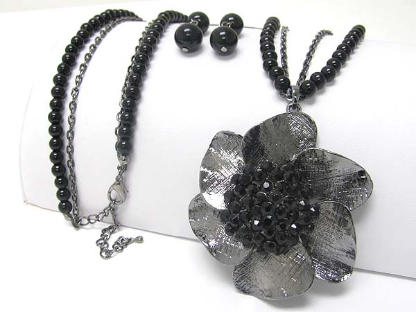 Crystal stud scratch meta lflower pendant pearl and metal chain long necklace set